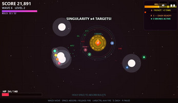 Hold your absorb field open to catch incoming enemy fire. Red bullets, green bullets, blue bullets — they all charge your energy. Release the field and every joule fires back as a beam, a nova, a chain blast, or the ultimate Singularity strike. The longer you hold, the harder you hit.