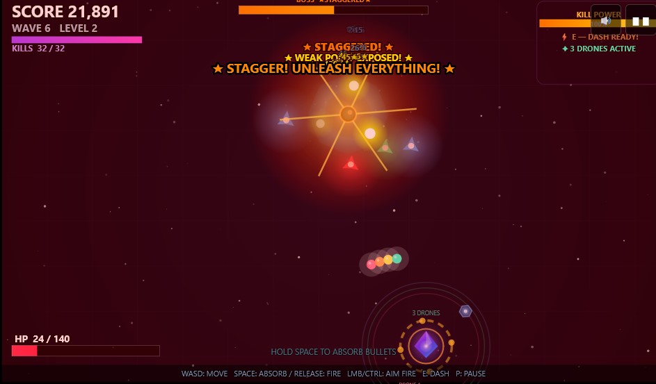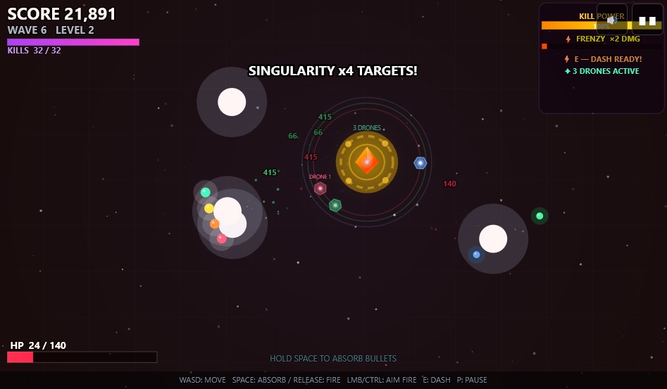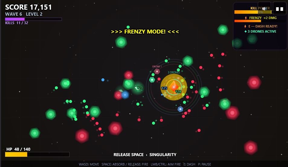 Your Kill Power meter builds as you rack up kills. When it maxes out, you trigger a Frenzy burst. Reach kill milestones — 10, 30, 60 — to unlock orbiting drones that fire alongside you automatically.