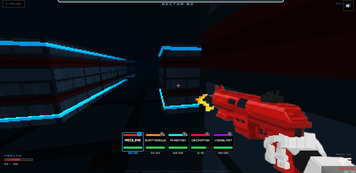 GRIDFYRE is a retro-styled first-person shooter built entirely for the browser, no install, no friction. Just raw pixel combat across four escalating sectors.