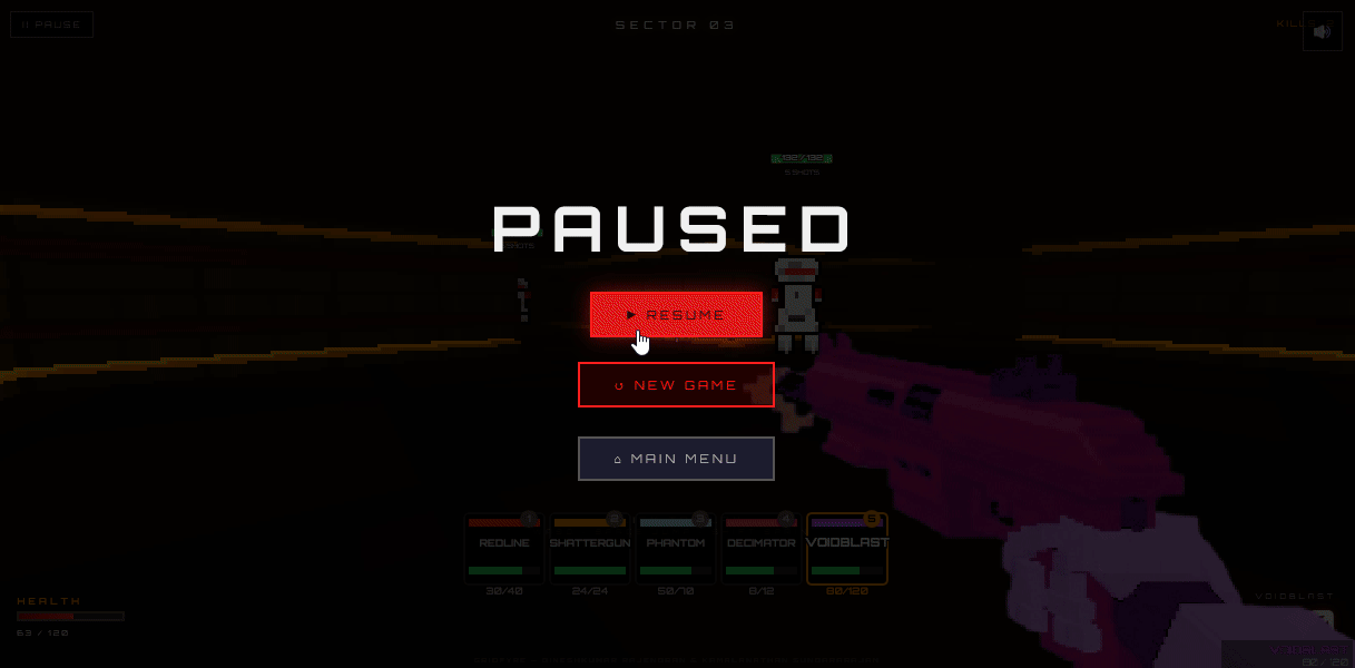 - 5 weapons — REDLINE, SHATTERGUN, PHANTOM, DECIMATOR, VOIDBLAST Each sector upgrades your arsenal with new capabilities and behavior